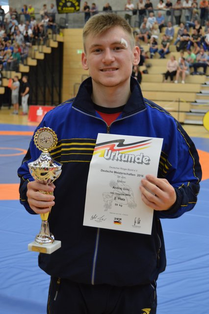 Mit einem Paukenschlag endeten die Deutschen Meisterschaften der Männer im griechisch-römischen Ringkampfstil für den kleinen Ringerverband Mecklenburg-Vorpommern. Der gerade mal im ersten Jahr der Junioren kämpfende Andrej Ginc vom SAV Torgelow sicherte sich bei seinem erstmaligen Start bei den Männern die Silbermedaille in der 59 kg-Klasse. Der Reihe nach besiegte der gerade mal 18jährige Sportschüler der Eliteschule des Sports in Frankfurt/Oder die doch bedeutend älteren Athleten Baris Diksu (ASV Nendingen/Württemberg) mit 6:3, Ibrahim Fallacara (KSC Niedernberg/Hessen) 3:0 und im Halbfinale Nick Scherer (SV Eschbach/Südbaden) mit 8:0 und zieht somit ins Finale der 59 kg-Klasse ein. Hier war er dann diesmal dem Titelverteidiger Christopher Kraemer (TSV Westendorf/Bayern) mit 0:8 unterlegen. Durch den Einzug ins Finale sicherte sich der junge Mann aus der Ueckerstadt den Titel des Deutschen Vizemeisters 2016.