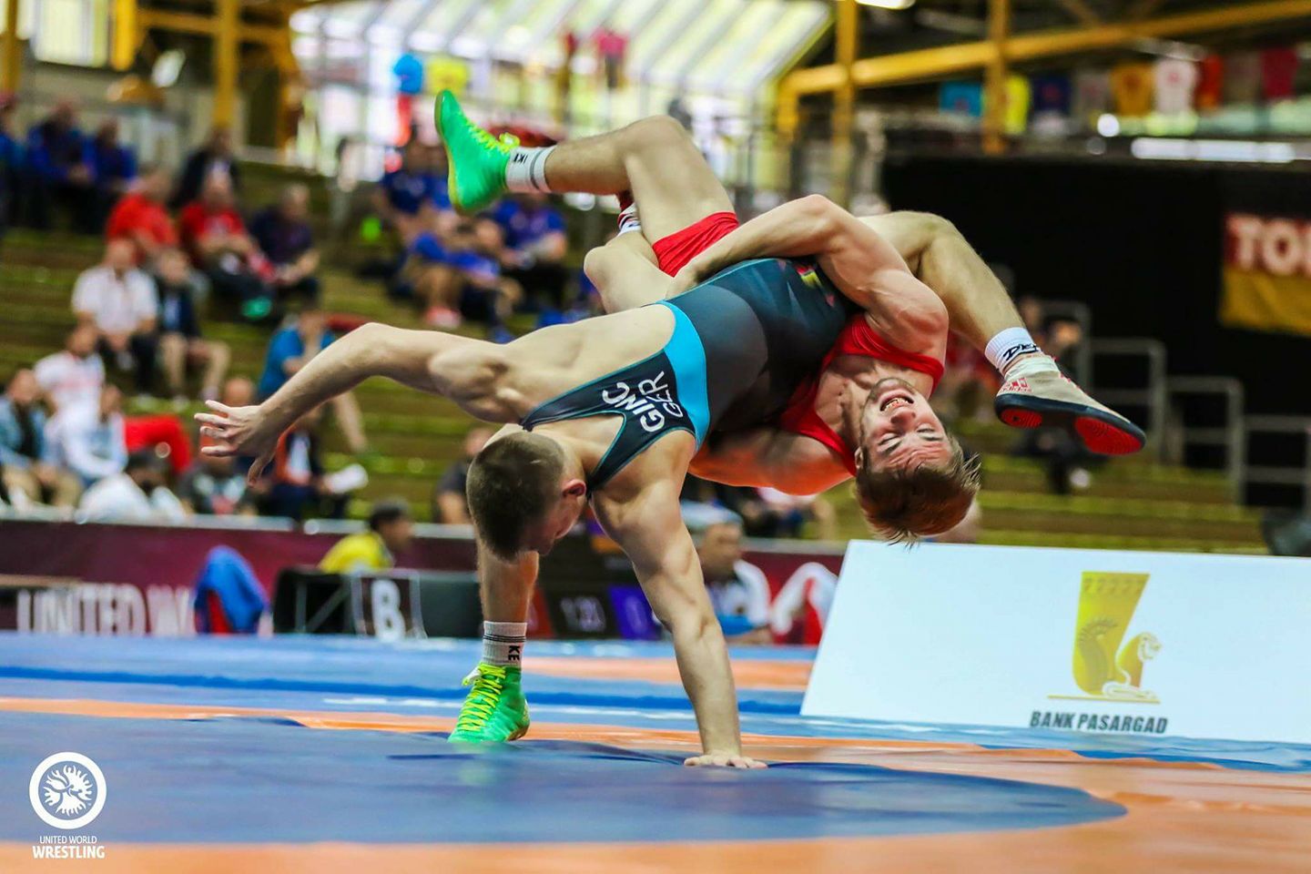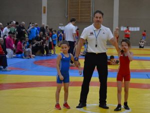 Kampfrichter Artur Leimann (Greifswald) leitet den Kampf zwischen den beiden Torgelowern Ole Brauer (blau) und Lucas Barz