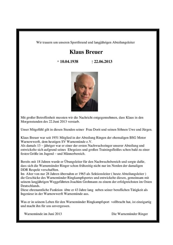 Klaus BreuerAm 22. Juni verstarb nach langer Krankheit das Ehrenmitglied des Ringer-Verbandes Mecklenburg-Vorpommern, Klaus Breuer, an Herzversagen. Die Urnen-Beisetzung findet am 02. August 2013 um 11: Uhr auf dem Friedhof in Warnemünde statt. Mit Klaus Breuer verliert der Ringer-Verband Mecklenburg-Vorpommern einen äußert verdienstvollen Ringer-Funktionär, der seit 1952 der Sektion Ringen der BSG Motor Warnowwerft Warnemünde vorstand.